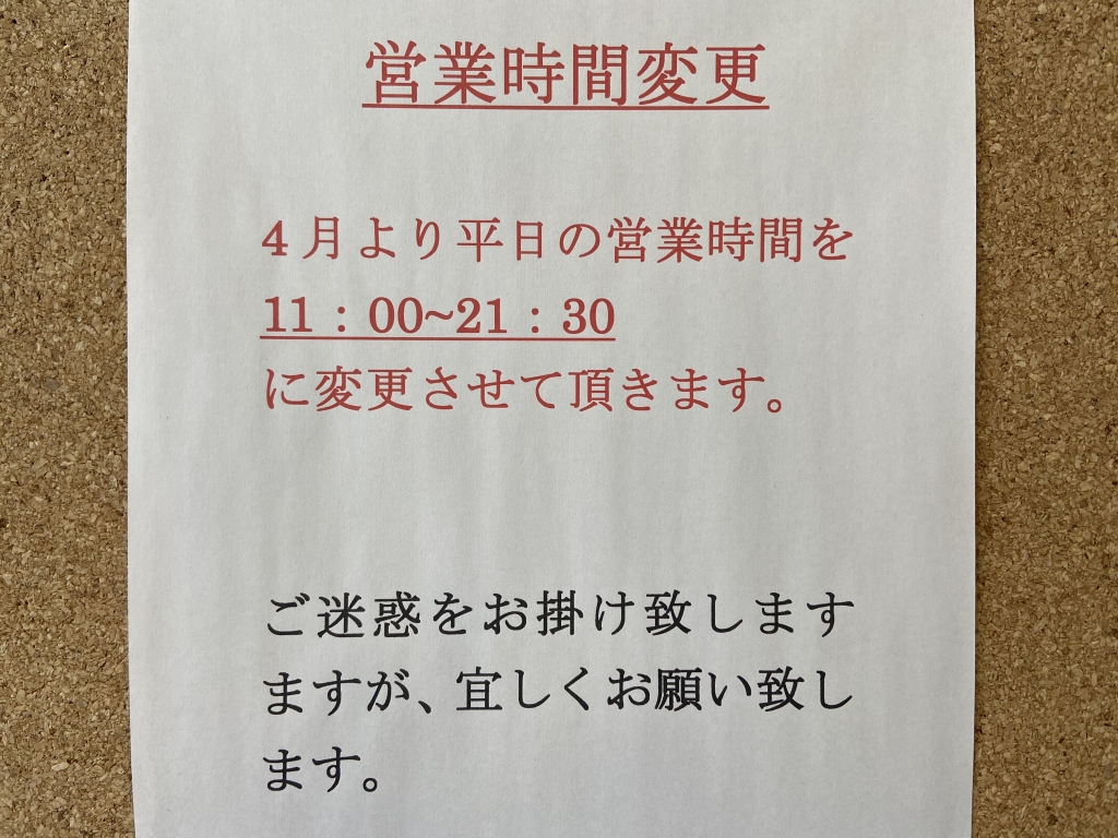 4月より平日の営業時間を